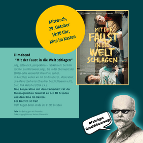 Lewin, #FetzigerGeschichtszeugs Beauftragter ;-) bei uns im Verein und aktiv im Vorstand hatte die Idee und sie wie war wunderbar! Mehr als 70 Leute besuchten unseren Fimabend “Mit der Faust in die Welt schlagen!”. Die Verfilmung des Romans von Lukas Rietzschel. Der war kurz zuvor in Dresden gewesen und fand die Idee unseres Filmabends ebenfalls klasse.