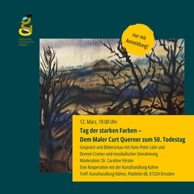 Am 12. März, 19:00 Uhr widmen wir uns dem Maler Curt Querner. Der langjährige Redakteur der Dresdner Hefte und Publizist Hans-Peter Lühr brachte in einem Sonderheft der Dresdner Hefte das Tagebuch des Künstlers heraus. Gemeinsam mit der Kunsthistorikerin Doreen Cramer von der Kunsthandlung Kühne werdern sie gemeinsam an das Leben und Werk des Künstlers erinnern. Die Moderation übernimmt Dr. Caroline Förster, die musikalische Umrahmung Florian Mayer. Der Eintritt ist frei, um Spenden wird gebeten. Eine Kooperation mit der Kunsthandlung Kühne. Treff: Kunsthandlung Kühne, Plattleite 68, 01324 Dresden.