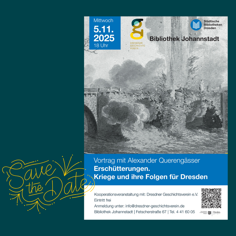 Was: Vereinsmitglied Dr. Alexander Querengässer spricht über die Auswirkungen von Kriegen auf Dresden. Die Veranstaltung ist eine Kooperation mit den Städtischen Bibliotheken Dresden